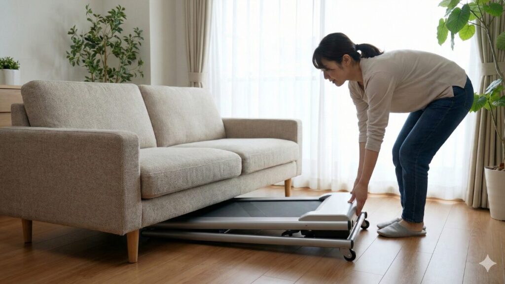 家庭用ウォーキングマシンを導入する際の最大の壁、それは「置き場所」ですよね。多くのルームランナーは、使わない時でもかなりの存在感を放ち、部屋を圧迫してしまいます。しかし、ウォーキングパッドs1はその常識を打ち破る「180度ダブルフォールド(二つ折り)技術」を採用しています。走行ベルトが真ん中でパタンと折れ曲がる構造になっており、収納時のサイズは使用時の約半分になります。 折りたたんだ時の厚みは約15cm程度。この薄さのおかげで、以下のような場所への収納が可能になります。