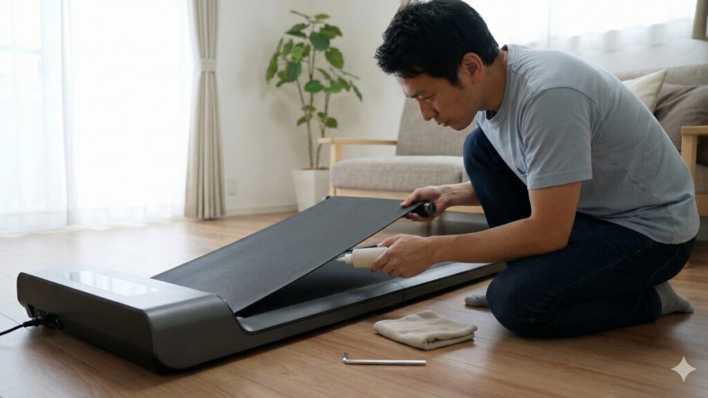 また、長く使っているとベルトが左右に寄ってしまうことがありますが、これは故障ではありません。本体後方の調整ネジを付属のレンチで回すことで、簡単にセンター調整ができます。右に寄っていたら右のネジを少し締め、左なら左を締める。この「ちょっとしたお手入れ」を惜しまないだけで、マシンはぐんと長持ちします。