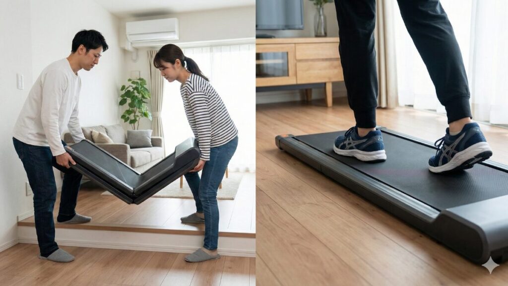 本体重量は約25kgと、決して「軽い」わけではありませんが、前面に付いている2つのキャスターを利用すれば、テコの原理で持ち上げることで女性一人でもコロコロと移動させることができます。出しっぱなしにしておくと、どうしても生活感が出てしまいますが、必要な時だけサッと取り出せるこの設計は、日本の限られた居住スペースにおいて正義だと言えるでしょう。「運動する場所を確保する」のではなく「空いたスペースを一時的にジムにする」という感覚。このスマートさこそが、ウォーキングパッドs1が都市部で支持される最大の理由かなと思います。