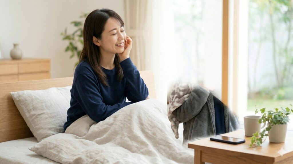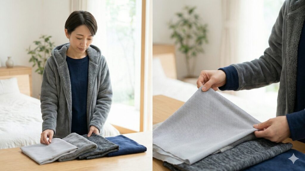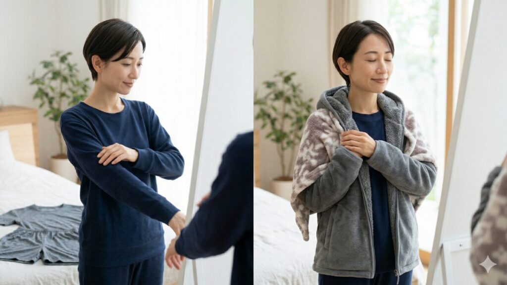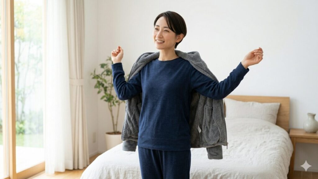 「冬場は1枚だと寒い……」という場合は、リカバリーウェアの「下」ではなく「上」に重ねてください。ウェアの上にパーカーやガウンを羽織る、あるいは毛布をしっかり掛ける。これにより、素肌とウェアの密着を保ったまま、外からの冷気を遮断できます。この「素肌にウェア、その上に保温層」というレイヤリングこそ、リカバリーマスターへの近道です。