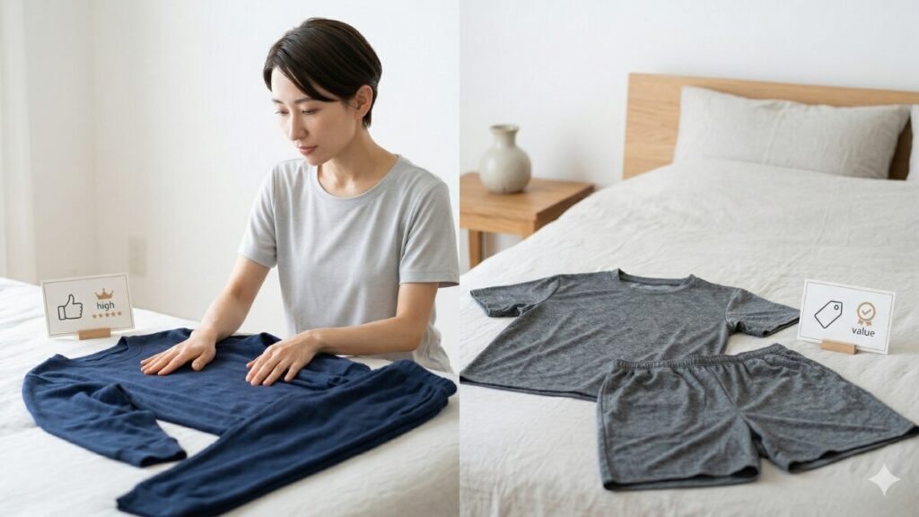 ここでの戦略的価値とは、ズバリ「洗い替えを含めたローテーションが可能になったこと」です。高価なウェアを1着だけ持っていると、洗濯が間に合わなかったり、生地が傷むのを恐れて着用を控えたりしがち。でも、リカバリーウェアの恩恵を最大化するには「毎日着ること」が何よりも大切なんです。安価な価格帯であれば、1着分の予算で2着、3着と揃えることができます。常に清潔なウェアをローテーションすることで、肌の健康も守れますし、何より「毎日リカバリー環境で眠れる」という習慣自体が、長期的な健康投資としてのリターンを大きくしてくれるんですよね。