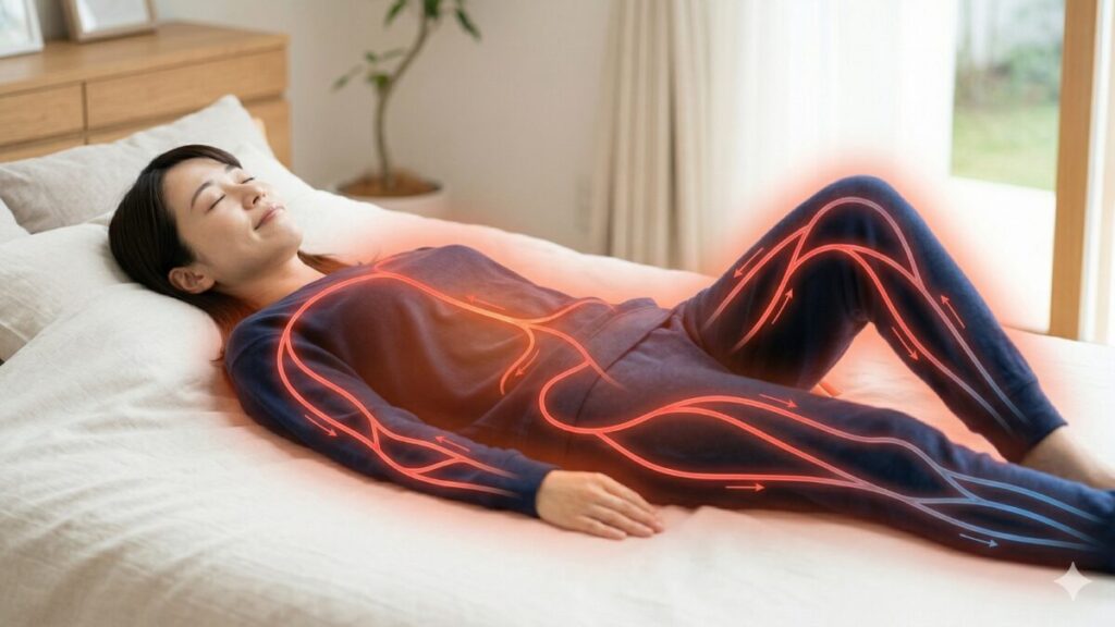 リカバリーウェアを着て「すぐ熱い!」と感じないのは、それが強制的な加熱ではないからです。あくまで自分自身の熱を効率よく循環させているだけなので、お風呂上がりのような、穏やかで持続的な温かさが続きます。これが副交感神経を刺激し、深い入眠へと導く要因になるんですね。