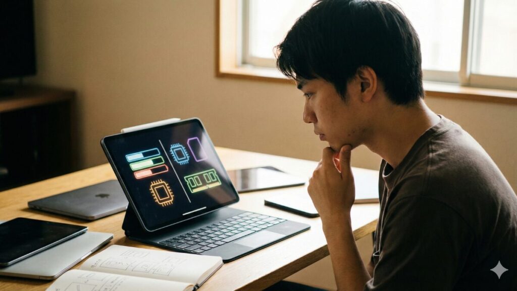 iPadでプレイしていて一番困るのが、いいところでアプリが突然終了してしまう「クラッシュ(落ちる)」現象ですよね。これは主に、iPadのメモリ(RAM)不足が原因です。無印のiPad(第9世代以前)などはメモリが3GB〜4GBしかなく、OSが使用する分を除くとゲームに使える領域はごくわずかです。