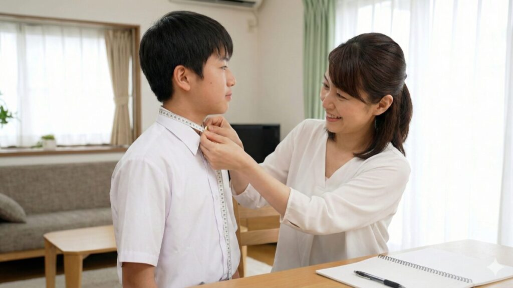 ネット通販でスクールシャツを買う時に一番ハードルが高く感じるのが「サイズ選び」ですよね。中学生の成長スピードは凄まじく、男子なら3年間で20cm近く身長が伸びることも珍しくありません。「すぐに大きくなるから」といって大きめを買いたくなるのが親心ですが、あまりにブカブカだと「服に着られている」ようなだらしない印象になりますし、肩の位置が落ちて動きにくくなってしまいます。逆にジャストサイズすぎると、半年も経たずにボタンが弾け飛びそうになり、買い替えコストがかさんでしまいます。