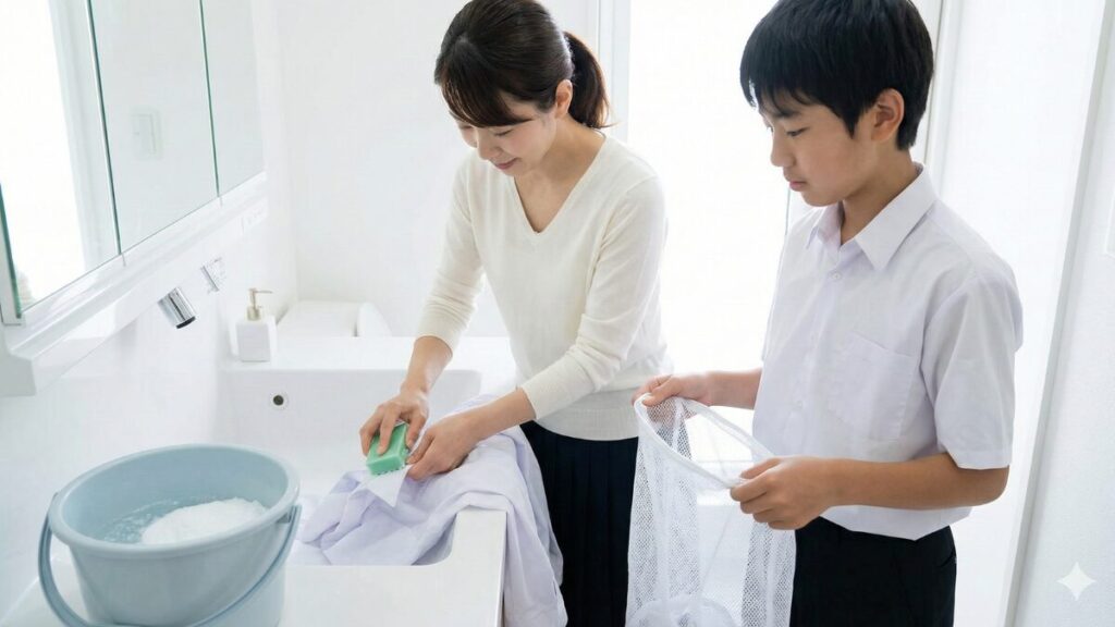 塩素系漂白剤はNG! キッチンハイターなどの「塩素系漂白剤」は強力すぎます。生地を傷めるだけでなく、シャツの繊維に含まれる樹脂加工や、プラスチックボタンを変質させ、逆に黄色く変色させてしまうリスクがあります。スクールシャツには必ず「酸素系」を使用してください。