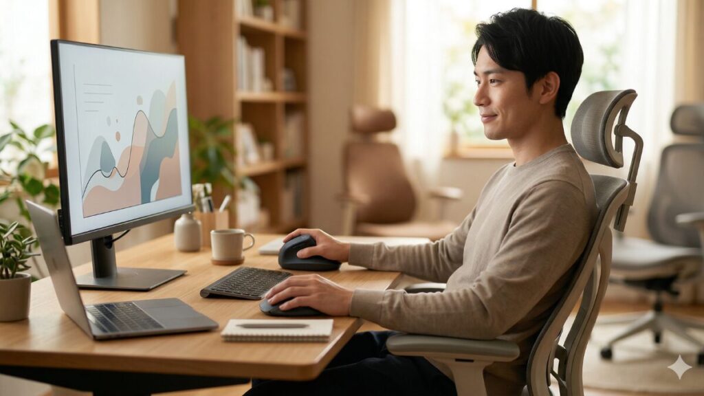 エルゴノミクスモデルに興味がある方は、まず自分の「手首の角度」を意識してみてください。デスクに自然に手を置いた時、手のひらが内側を向いているなら、垂直型やトラックボールが劇的に合う可能性が高いです。