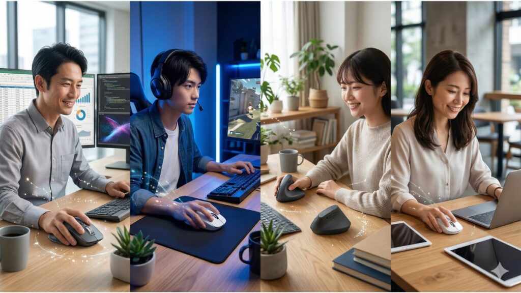まずは、皆さんが一番知りたい「結局どのモデルが自分に合っているの?」という疑問に対する結論からお伝えします。ロジクールのマウスラインナップは、大きく分けて「ビジネス・プロフェッショナル向け」と「ゲーミング(ロジクールG)」の2軸で構成されています。それぞれの代表的なモデルを比較表にまとめたので、自分の主な利用シーンを想像しながらチェックしてみてくださいね。