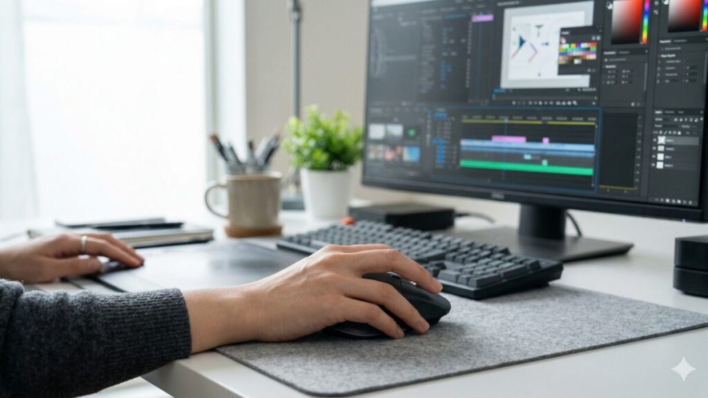 私が愛用しているMX Master 3Sには、親指の位置に「サムホイール(サイドホイール)」が搭載されています。これがクリエイティブ作業、特に動画編集や楽曲制作において「神機能」なんです。通常のホイールは上下のスクロールですが、サムホイールを使えばタイムラインを左右に高速移動させることができます。拡大・縮小と組み合わせれば、数時間の動画素材の中から必要なカットを数秒で見つけ出すことすら可能になります。Adobe Premiere ProやPhotoshop、Final Cut Proといった主要なクリエイティブソフトには、最初から最適なプリセットが用意されているのもロジクールならではの強みですね。