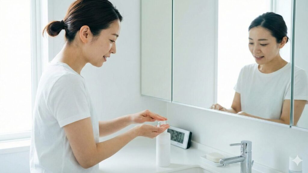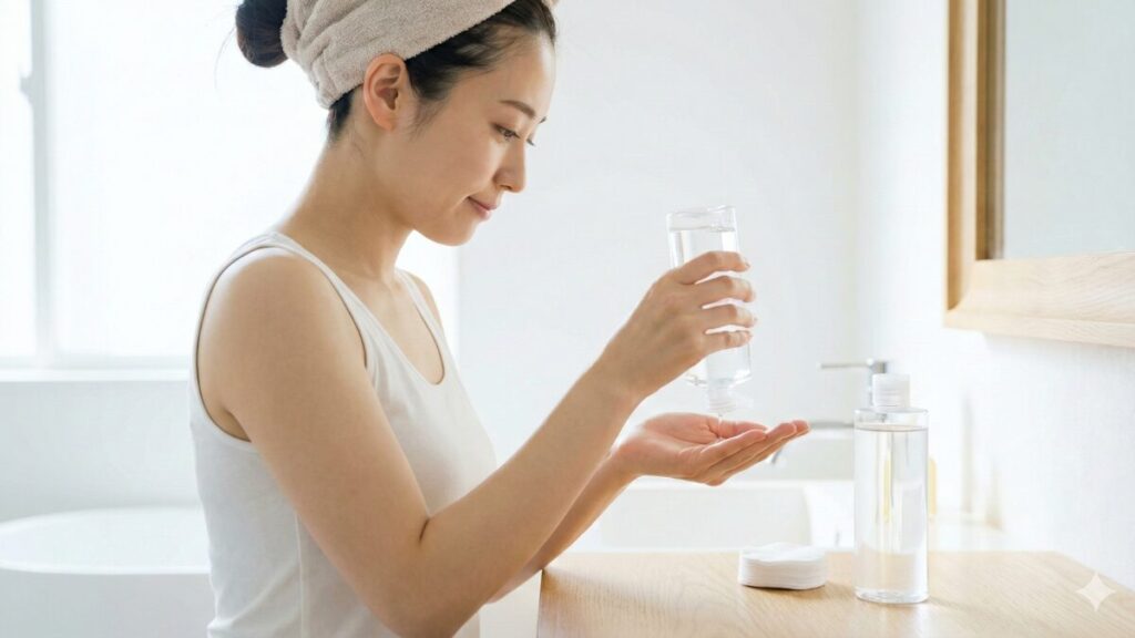 私は、この魔の時間帯を乗り切るために、お風呂から上がったら体を拭くよりも先に、まず導入化粧液を顔全体に馴染ませるようにしています。浴室の中に置いておくのも一つの手です。こうすることで、着替えたり髪を乾かしたりしている間も肌の潤いを守り、その後のスキンケアをゆっくり行う余裕が生まれます。