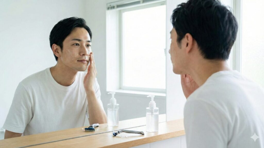 まず理解しておきたいのが、男性の肌質です。男性の肌は女性に比べて皮脂量が約3倍もある一方で、水分量は半分以下と言われています。つまり、表面は脂っぽくテカっているのに、内側はカラカラに乾いている「インナードライ(隠れ乾燥)」の状態になりがちなのです。さらに、毎日の髭剃り(シェービング)によって角質層が削り取られ、バリア機能が低下しています。
