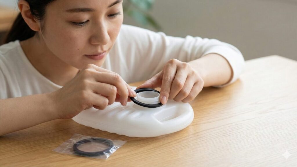 湯たんぽを長く安全に使い続けるために、最も重要なメンテナンス部品が「ゴムパッキン」です。キャップの裏側に付いている、あの黒い輪っかですね。