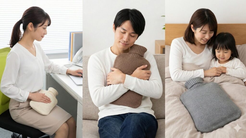 お湯をたっぷりと入れた時のずっしりとした適度な重み(Mサイズで約1.5kg前後)、ポリエチレン本体の柔らかな曲線、じんわりと伝わってくる体温のような温かさ、そしてカバーのふわふわとした毛並みのような感触。これら全ての要素が組み合わさることで、まるで膝の上やお腹の上に猫を乗せているかのような、不思議な安心感と癒やしを与えてくれるのです。