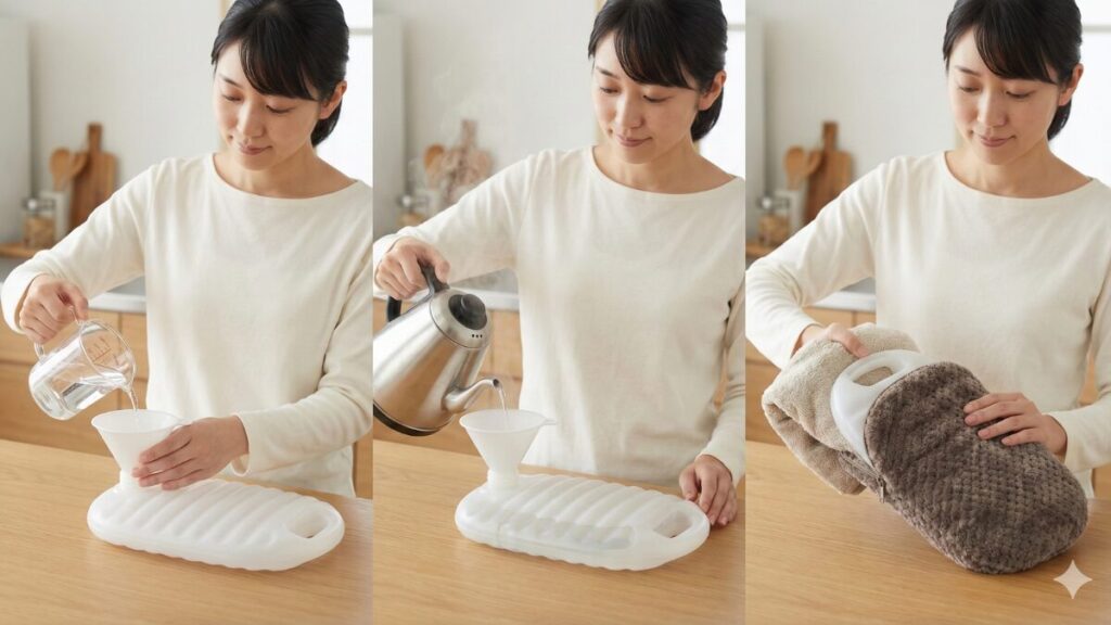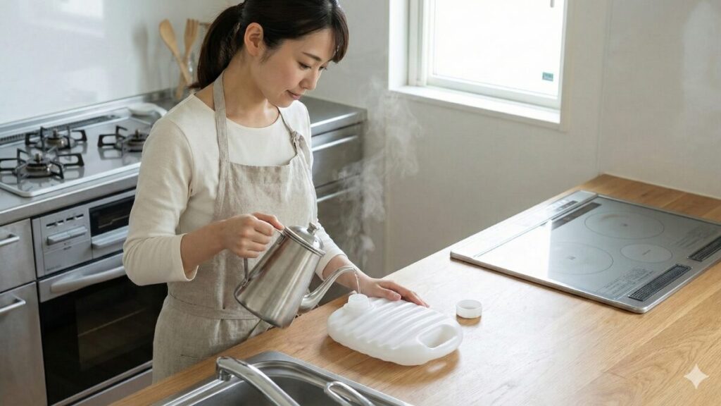 二つ目は「温度調整」です。メーカーが推奨する湯たんぽの適温は、実は100℃ではなく70℃〜80℃程度です。熱湯だけで満たすと温度が高すぎてパッキンの劣化を早めたり、内圧が上がりすぎたりする原因になります。あくまで目安ですが、「水:熱湯=1:2」くらいの割合で混ぜると、計算上およそ70℃前後の適温になり、かつ量もちょうどよくなります。
