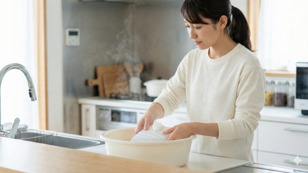 正しい解決策は非常にシンプルです。「本体全体をお湯につけて温める」こと。洗面器やシンクにお湯(お風呂くらいの温度でOK)を張り、キャップ部分を下にして数分間浸してみてください。中の空気が温まって再び膨張し、内圧が戻ることで、嘘のようにスルッと軽く開くようになります。「冷えて縮んだなら、温めて戻す」。これさえ覚えておけば、朝の忙しい時間に格闘する必要はありません。