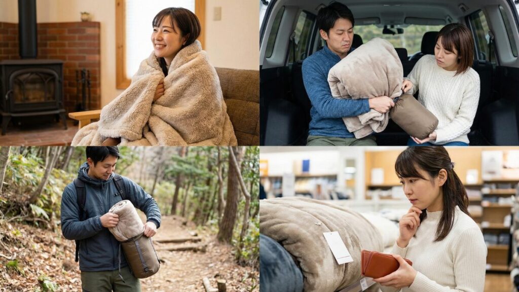 「Sサイズでも(膝掛けとしては)意外と大きい」「Lサイズは(持ち運ぶには)重い」という、サイズ選びのミスマッチに関する指摘がいくつかありました 。やはり用途(膝掛けか、寝具か)を明確にしてからサイズガイドを熟読するのが重要ですね。 - 収納性
